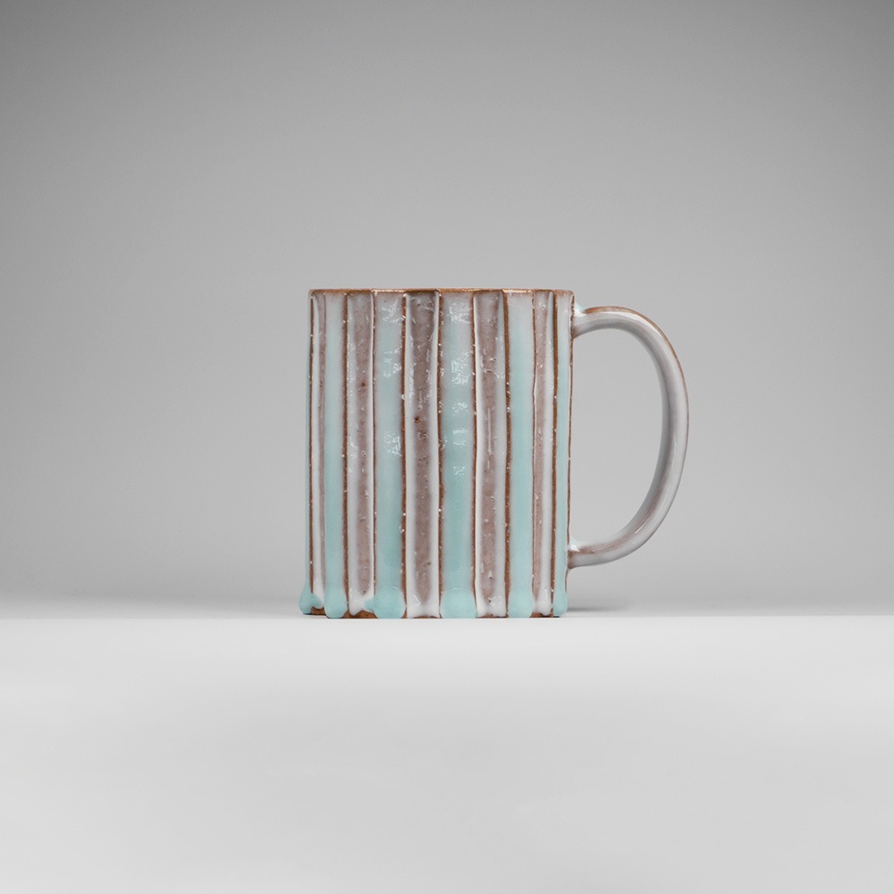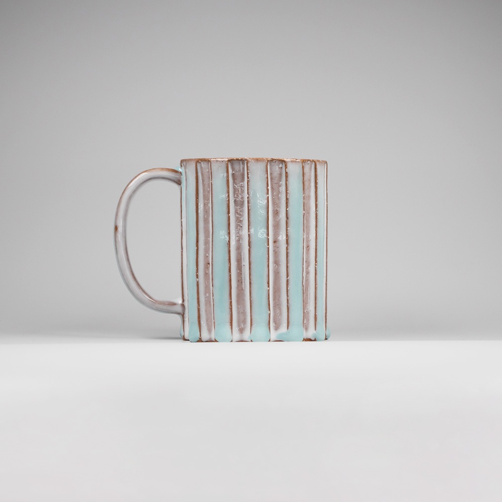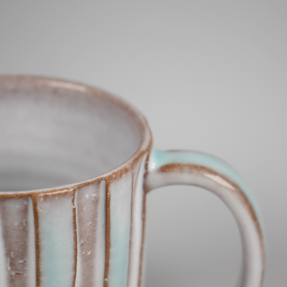 凹凸があり、白と緑のストライプがお洒落で存在感のあるマグカップです。