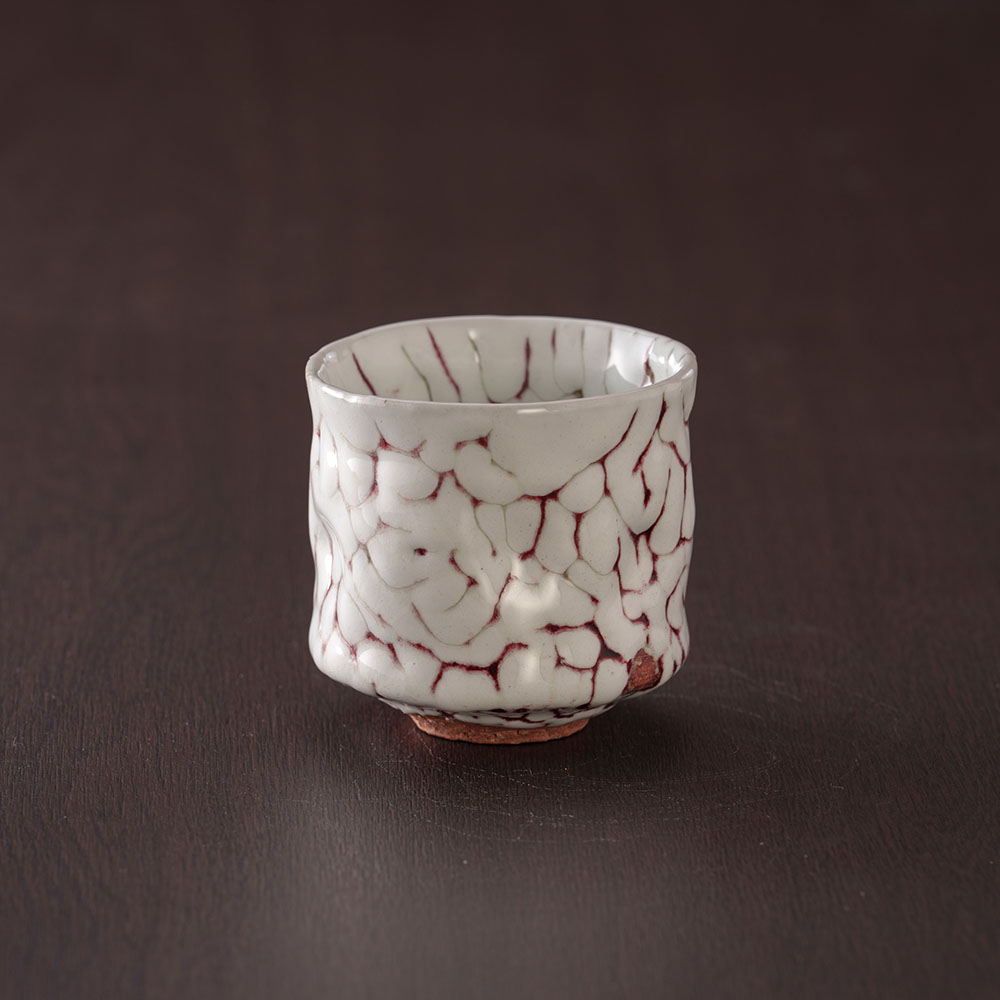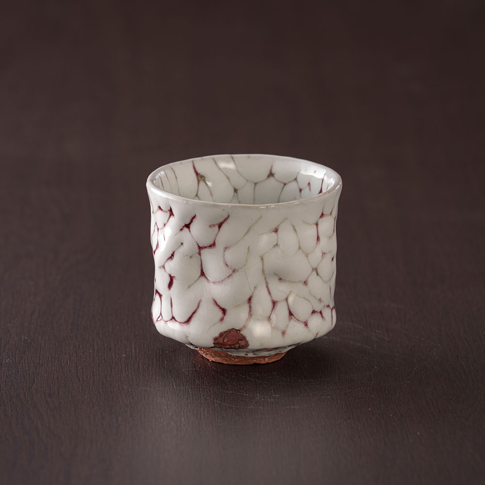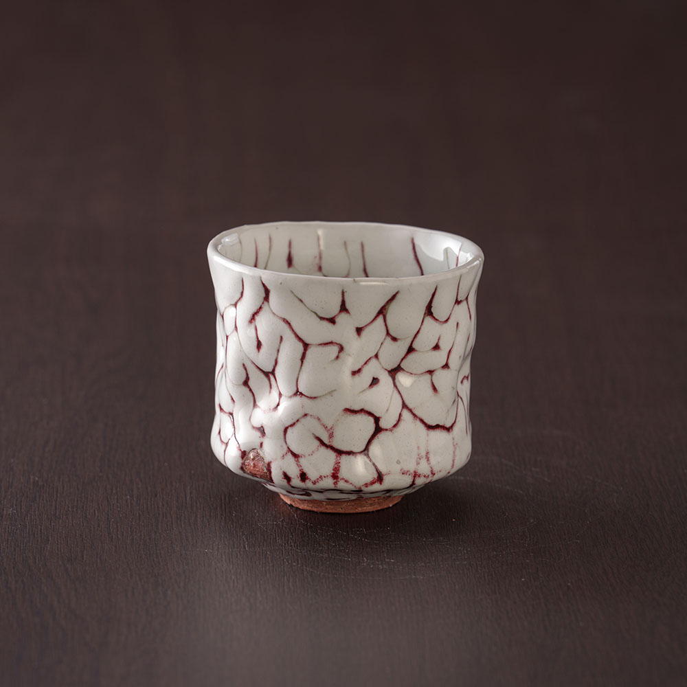 ちぢれた釉薬に紅色の釉薬が施され、萩焼では珍しい紅色の作品。