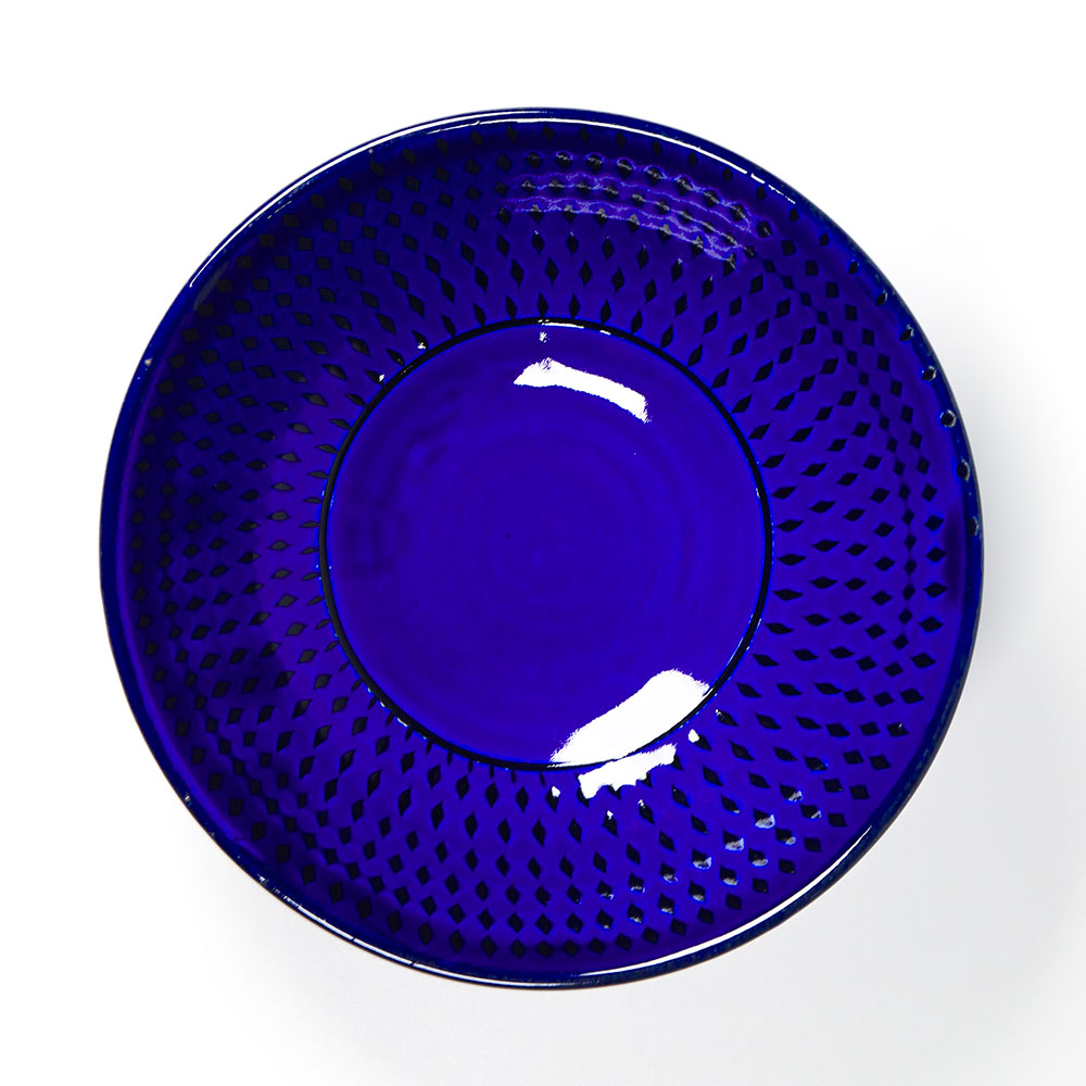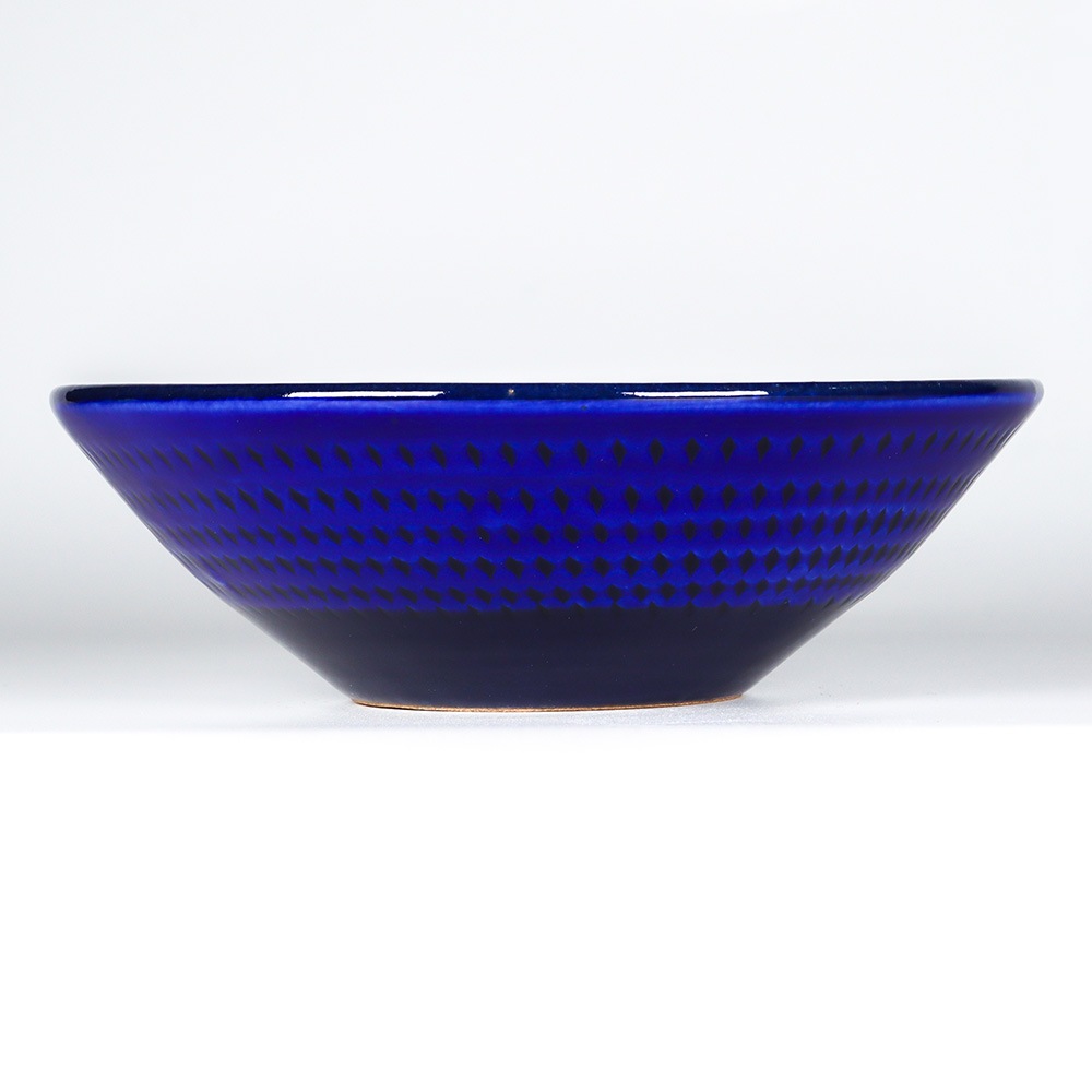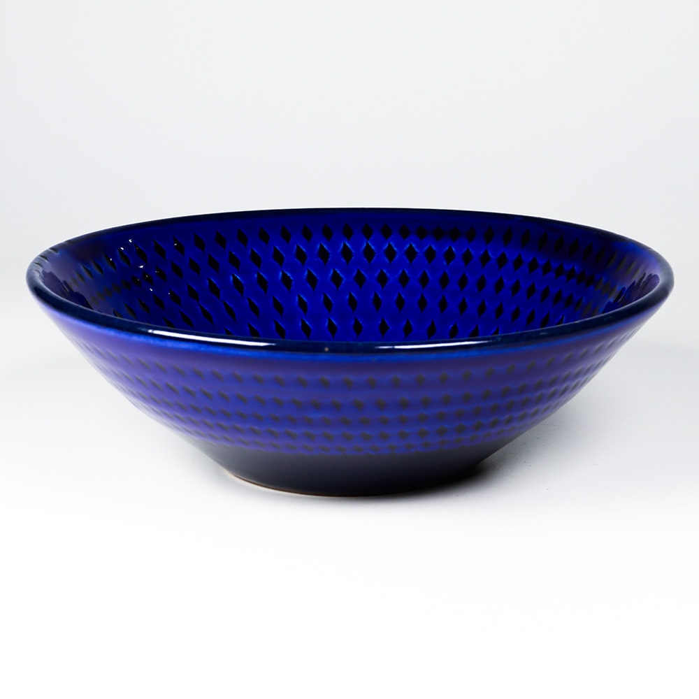 澄んだ瑠璃色と控えめに映る飛鉋が上品な器。サラダや汁気の多いメイン料理に。