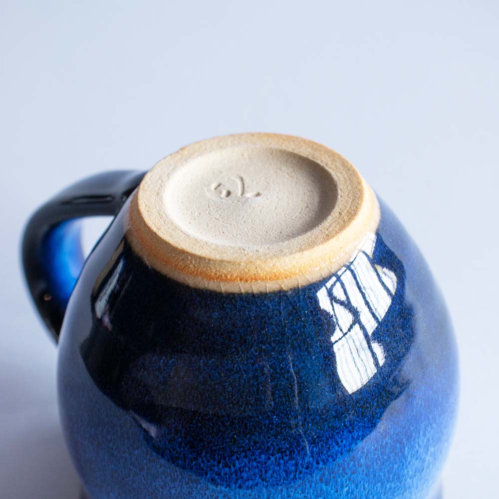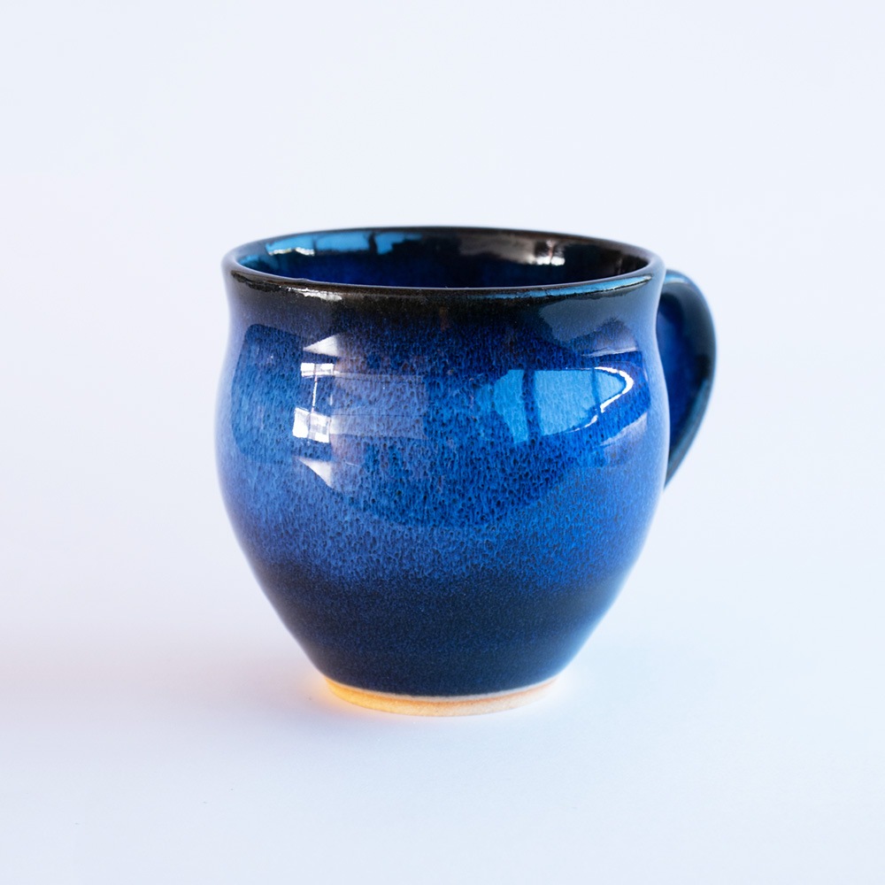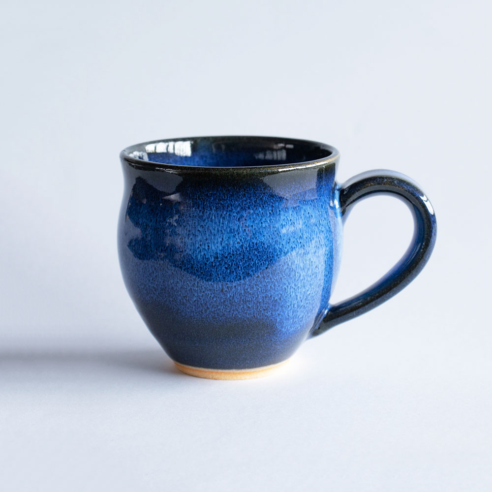 萩焼のマグカップです。持ちやすい大きな取っ手とシンプルなデザインでとても使いやすいです。軽量なのもおすすめポイントです。印象的な深い青色が魅力的です。内容量は8分目までで220mlです。