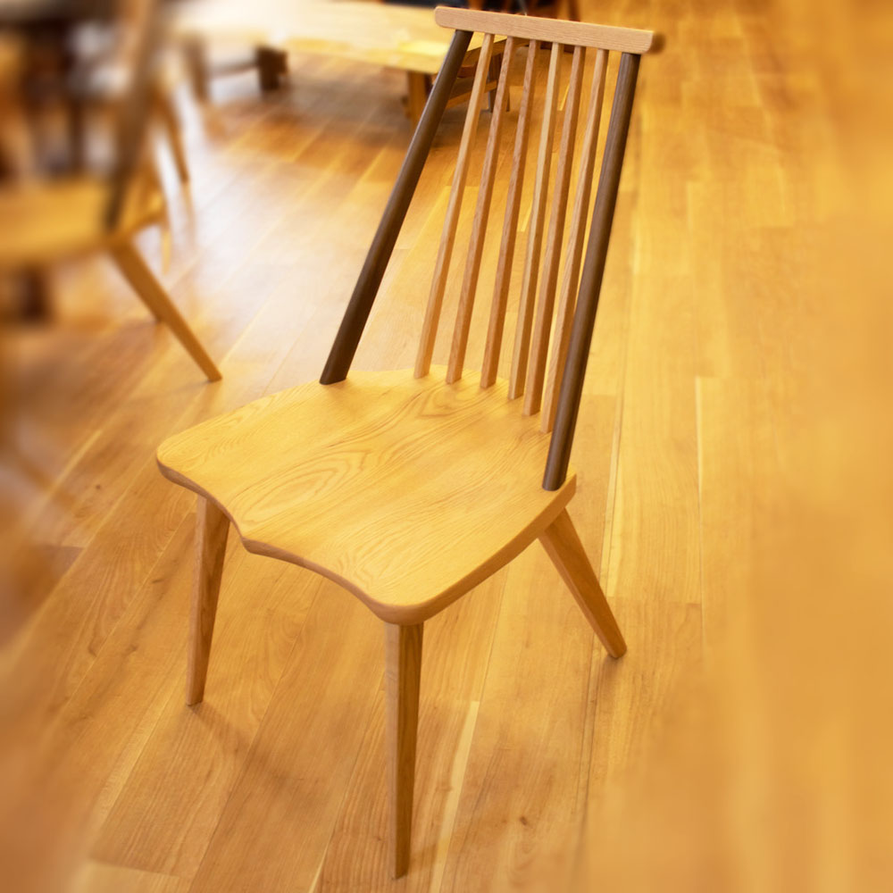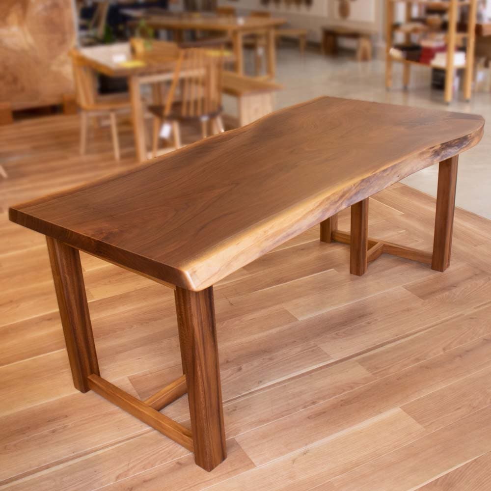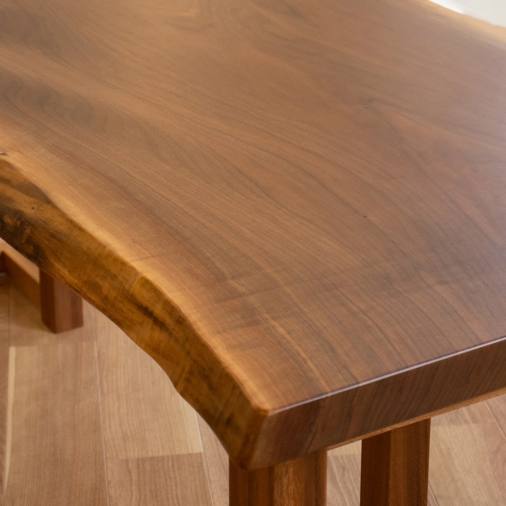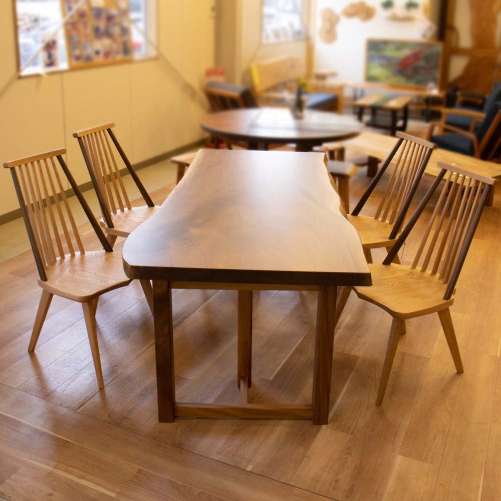 渋い色が人気のブラックウオールナットの一枚板のダイニングセット。背もたれが高い座り心地のいい椅子が4脚セットです。テーブルの足の高さはオーダー可能です。(お問い合わせください)