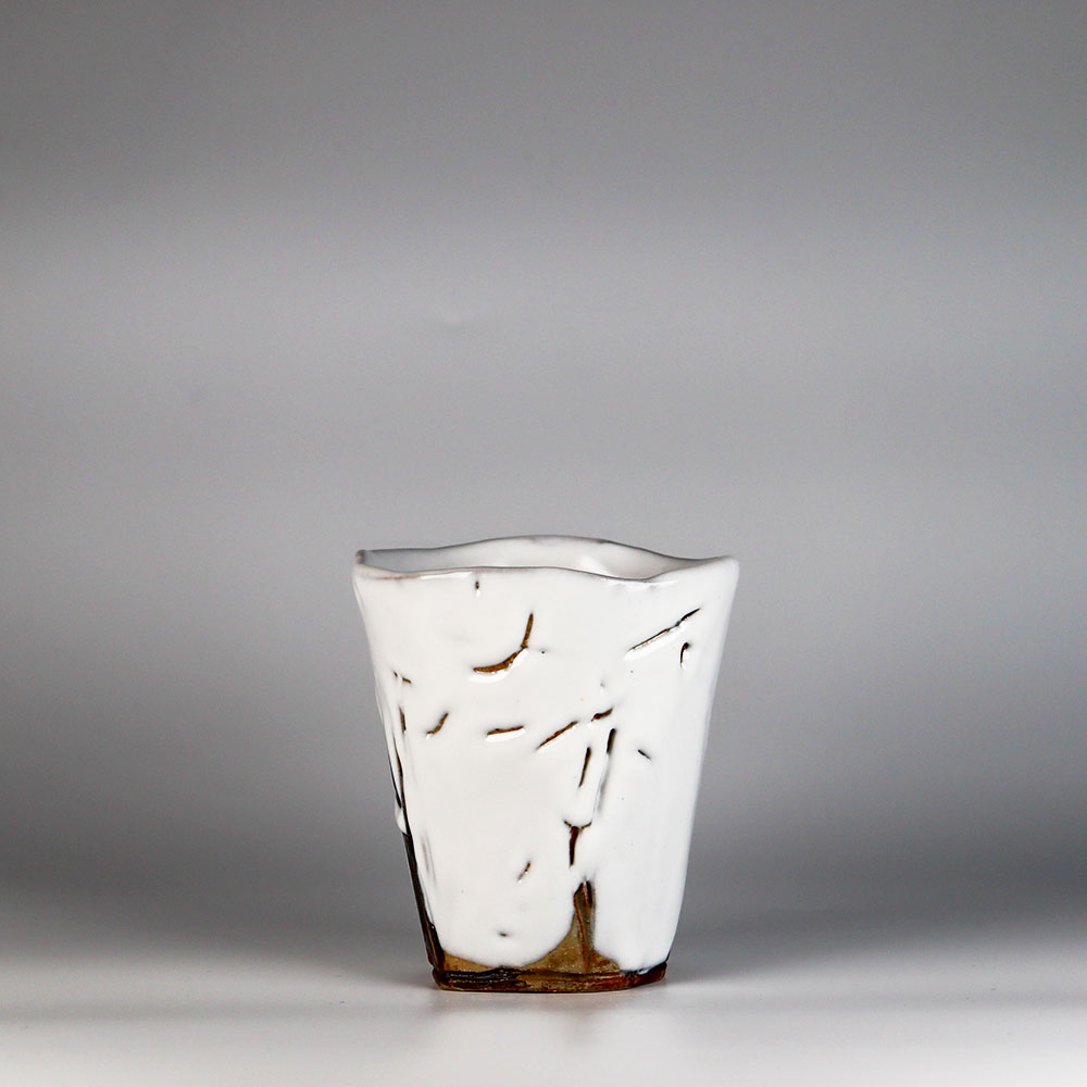 三島土を下地にかけ、その上に白萩カイラギ釉をかけています。
